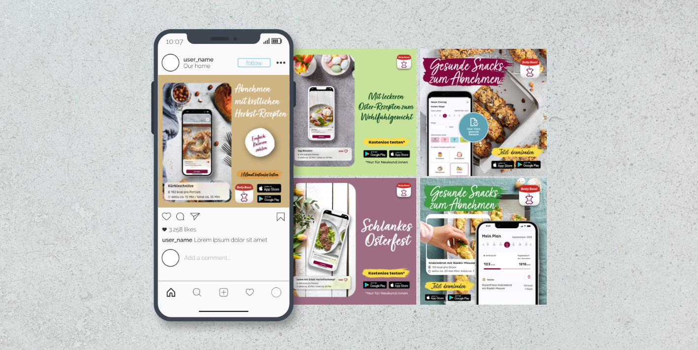 Betty Bossi is a Swiss recipe app, with a separate app, promoting healthy weight loss recipes. I designed ads for social media plattforms, advertised in different formats, languages and locations.