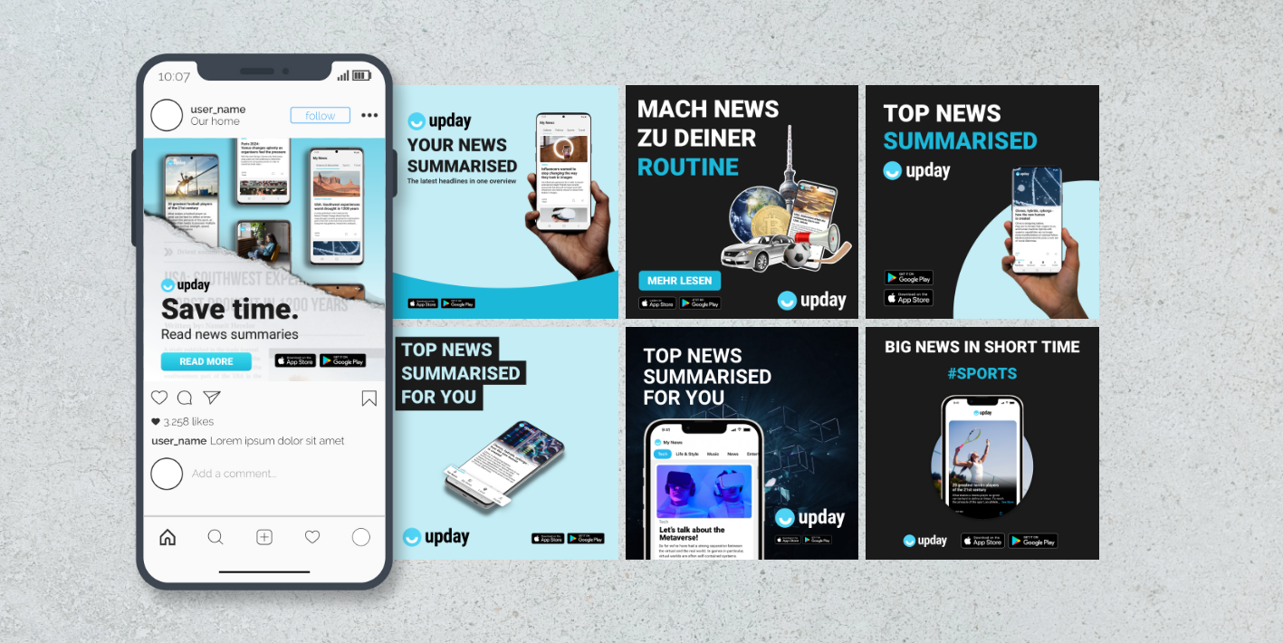 Upday is a German news app, gathering the most important daily news in a simple overview. I designed ads for social media plattforms, advertised in many different formats, languages and locations.